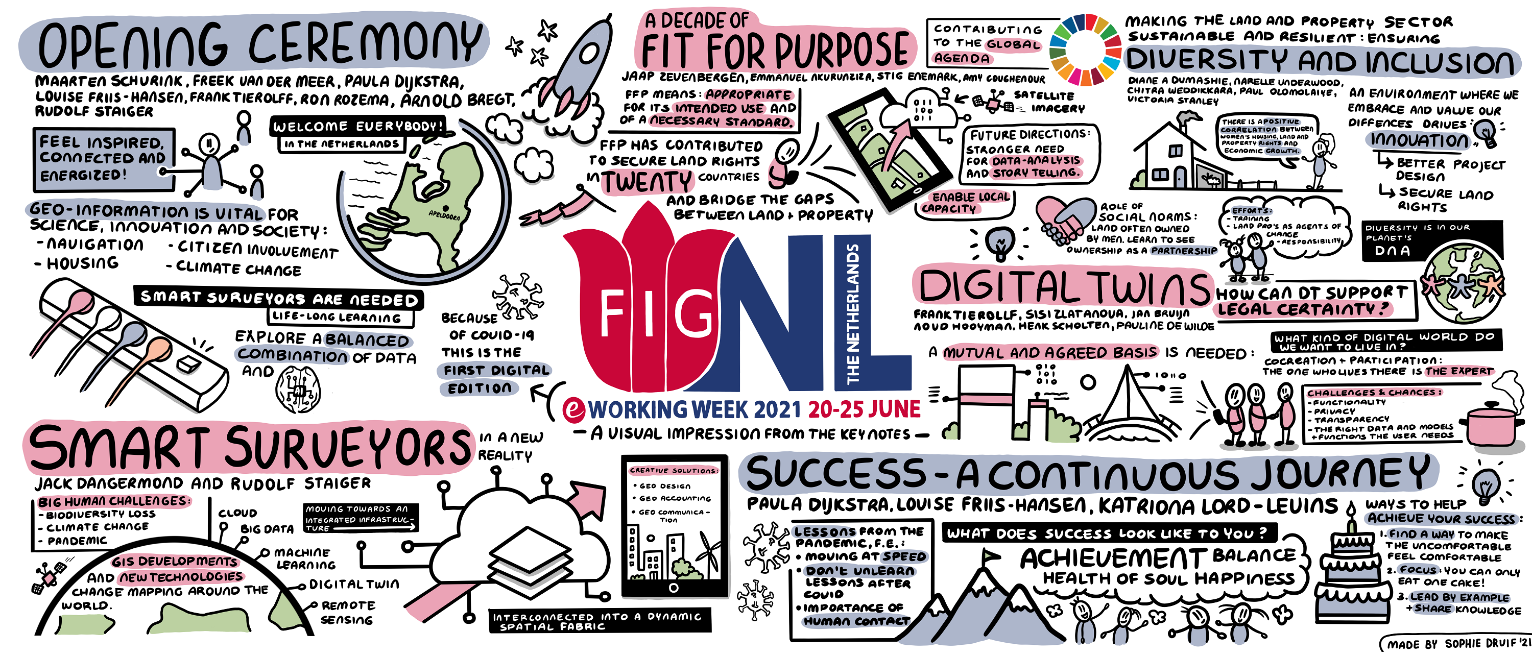 The Opening Ceremony of the FIG e-Working Week 2021 took place on Monday 21 June, live from our studio in Apeldoorn, the Netherlands. We are excited to share with you the recording of the Ceremony, which includes the official welcome by the Secretary General of Ministry of the Interior and Kingdom Relations, the keynote by the Dean of Wageningen University & Research, and the welcome addresses by FIG, GIN, Kadaster and ITC! The fact that the Working Week has been transformed to take place virtually brings in new opportunities. This special e-Working Week will be accessible from all over the world, allowing the whole FIG Community with over 250.000 members from 120 countries to join in the event. From the organizing side we will do our utmost to bring together an unforgettable conference with possibilities to make meaningful connections with our sponsors, attendees and speakers, as well as attend sessions designed to be interesting, innovative and engaging. Drawing made by Sophie Druif on some of the Keynote sessions: