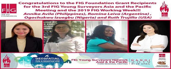 The FIG Foundation is a part of FIG (International Federation of Surveyors) that assists the Young Surveyors, by giving them grant to attend and participate in the FIG Working week in any country that would be hosting the FIG Working week. The Foundation also gives Scholarship and donation to Surveyors in continuing education. I, Izuegbu Ogochukwu Uju, from Nigeria, was able to get the grant to attend 2019 FIG Working week in Hanoi, Vietnam from July to July, 2019, alongside with Ruth Lailany Trujillo, Annika Avila, and Romina Yohana Leiva.