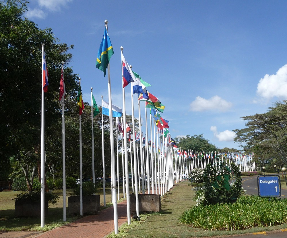 The flag alley entrance at the UN-HABITAT Headquarters in Nairobi.
