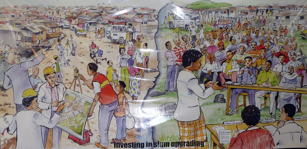 Foyer cartoon poster showing the surveying activity for slum upgrading.