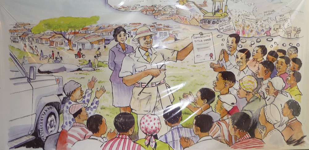 Foyer cartoon poster showing the land registration process for slum upgrading.