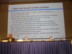This year’s theme ‘Scaling up Responsible Land Governance’ paid special attention to working in all aspects of land at scale, to mainstream thematic issues, identify innovations, and sustain investments in land governance.  The conference opening presentations all signaled the importance of land in the emerging Urban Agenda of Habitat III, the keynote speaker Paul Romer, Professor of Economics, at the Stern School of Business at New York University raised the importance of a realistic policy approach for growth and shared prosperity to urban expansion, with the provocative message “Let people come, and they will build”.The annual conference includes three days of parallel sessions across the range of land professional activities including: spatial data, country case studies, community land, implementing good land governance at the global scale, valuation, land urbanization processes and water resources. Noteworthy were sessions and papers that embed the issues of equality for men and women to access land.