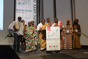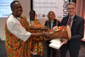 Co-conference director Pekka Halme receives a drum from the local organising committee 2021