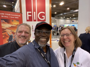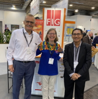 Tim Burch, FIG Working Week 2023, and Kwame Tenadu, FIG Working Week 2024 at the FIG stand with FIG Director Louise Friis-Hansen