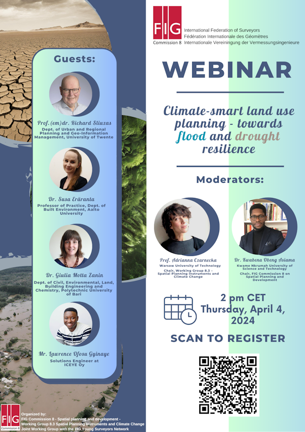 FIG Commission 8 Working Group 8.3 on Spatial Planning Instruments and Climate Change is organizing the webinar “Climate-smart land use planning - towards flood and drought resilience.” The webinar will take place via the FIG Zoom platform on 4th April 2024 at 2 pm CET.