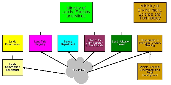 There are six land sector agencies involved in Ghana’s land administration project (Figure 1). These agencies have technically been operating manually in an environment beset with conflicting and unreliable dada, dubious manipulations of existing data by some recalcitrant staff and tedious retrieval of available information, suggesting the need to establish or develop computer-based land information systems and networks through re-engineering processes and pushing for attitudinal change. It is not the manual systems per se that are the cause of the problems (although they have contributed significantly); it is the fact that there are costs, delays and uncertainties as well as rent seeking behaviours in the system. Generally, details of flow-lines of information are seldom documented or monitored. Based on better management of information, substantial improvement within the lands sector can be brought about by analysing and costing existing procedures, abandoning unnecessary practices and making better use of existing resources through the introduction of Information Technology (IT) and LIS (UNCHS (HABITAT), 1990). Essentially, most organisations would be keen to know how LIS could fit into their overall IT strategies.