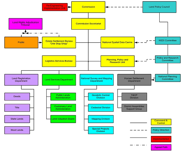 The proposition that, in the initial stage of implementation, each agency should be re-engineered and strengthened as individual bodies since re-engineering will involve creating centres of information about land administration, land values and taxes et cetera involving the coordination of organisational and technological change ought to be taken seriously. The issue then would be ensuring proper networking arrangements between the existing agencies (after re-engineering) under the GIS Coordinating Committee that will operate as a Land Information and Management Advisory Board, with links to Ghana’s SDI, NAGIM. GIS has a critical role to play in this and whilst there is need for organisational reform, the ‘big bang’ approach cannot be a viable option, technically. After the merger of the agencies the above ‘departmental approach’ may metamorphosize into a ‘GIS enterprise model’ but only after care consideration based on empirical evidence.