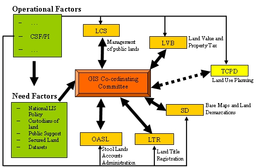 Referring back to Figure 4, each agency will have to use appropriate suite of methodologies (for example Critical Success Factors (CSF)/Performance Indicators (PI)) and others where appropriate (constituting operational factors)) to determine its needs in relation to the overall national need (need factors, that look at national GIS goals, land as a resource, the role of custodians of such lands, the public as stakeholders and issues relating to datasets) whilst being co-ordinated by the GIS Coordinating Committee. The Committee is expected to oversee data integration and ensure increased capacity for data sharing, instilling the concept of information as a corporate resource into all the land agencies. Each individual organisation’s long term plan must relate directly to the long-term plans of the central government (LAP) it serves (Huxhold, 1991). For GIS implementation, there should be clear lines of responsibility for each participating agency and adequate incentives that allow work to be done constructively to achieve the GIS project objectives.