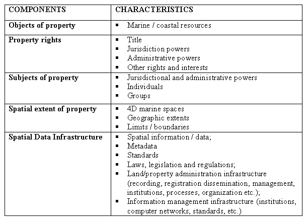 The components of any marine geospatial data infrastructure are expected to include key spatial data, computer network infrastructures, spatial data management software and other software, data- and other standards, metadata, stakeholders, and possibly a spatial data clearinghouse. Table 1 shows spatial data infrastructures as part of a marine information system from a property rights perspective.