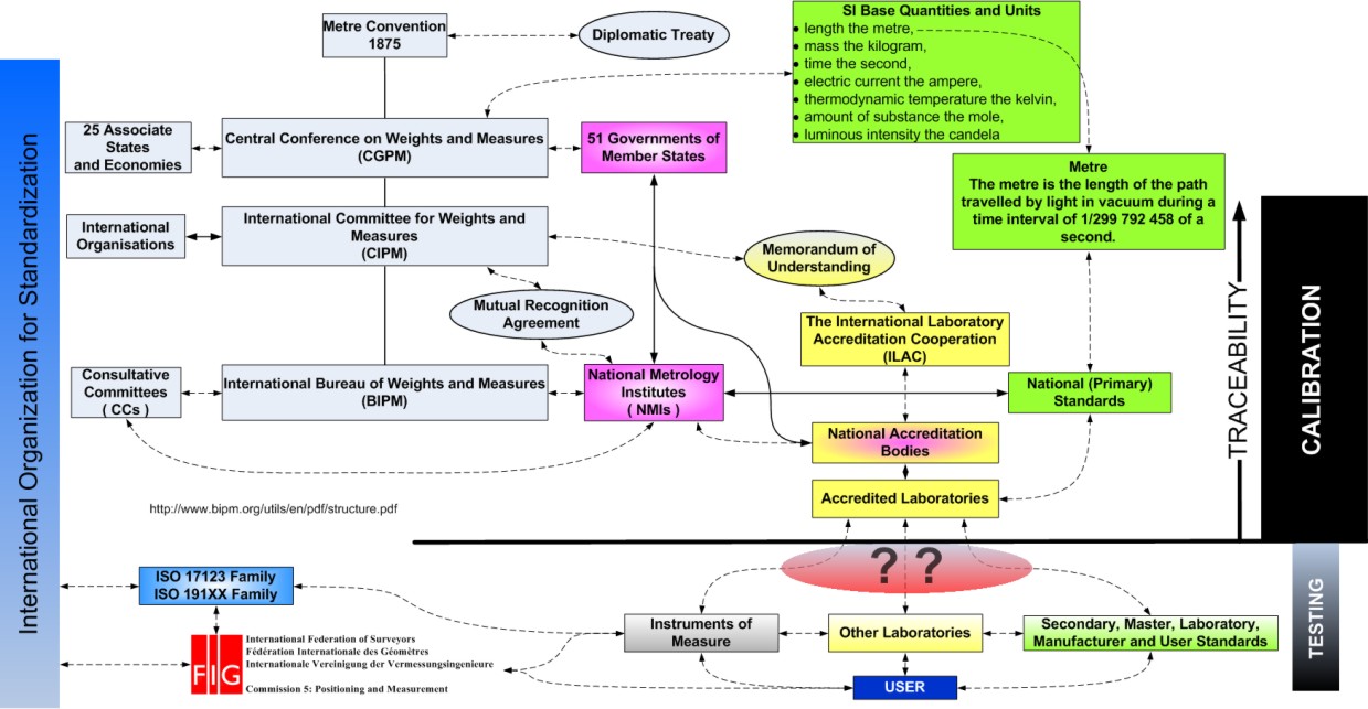 Instrument testing (ISO 17123) should not be confused with an instrument calibration. Calibration links the instrument directly to international standards (see Figure 1 below). Calibration is the act of checking or adjusting by comparison with a standard or reference the accuracy of a measuring instrument. A standard or reference is an instrument or method that will measure more accurately and precisely the desired quantity than the measuring instrument itself. For example a laser interferometer measures more accurate distances (relative displacements) than a total station Electronic Distance Meter (EDM).