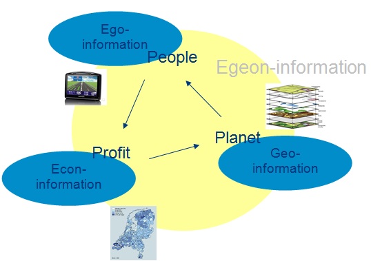 In figure 1 it is shown how geospatial information is linked to this concept of development. To clarify better, the information is translated into three different types of information. To support ‘people’ related information demands, so-called ‘ego-information’ is required. For example the use of navigation systems (‘where am I?) is considered to be a form of ego-information. ‘Profit’ related information is referred to as ‘econ-information’. This information is necessary for making economic choices and performing financial analysis. Our information describing the ‘Planet’ component is referred to as ‘geo-information’ (information describing our physical world). For example our topographic data datasets play in important role in land use planning in the Netherlands. But also the geodetic reference system Kadaster maintains is of an essential value of linking the national available geo-information to the geospatial databases in the Netherlands. Combining the three types of information the total of information supply could be indicated as ‘Egeon-information’.
