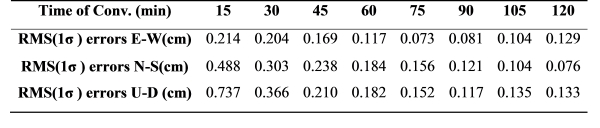 The 3-dimensional RMS errors 120 to 130 minutes after the start of each test are 0.200m, 38% higher than the RMS errors calculated from 120 minutes to the end of each test. For comparison, the RMS error values for different convergence times are shown in Table 8. Here also can be seen that 120 minutes are not enough to full convergence, the 3-dimensional RMS errors being 26% higher than the final value.