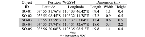 using ROV and manual inspection by divers confirmed that SO-01, SO-05,