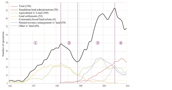 At present, the Bank has committed more than US$800 million in standalone land tenure operations and more than US$1 billion in operations with land tenure components/activities (Bourguignon et al., 2015) as land tenure issues are again vital for issues such as governance transparency, recovery from financial crisis, as well as investment in agriculture for food security and bio fuel improvement to address climate change. Currently there are 17 standalone land administration projects all around the world, while there is planning for more, and 30 more development projects that also include a land component which require adjudication and recording of private property rights. The World Bank is also doing specific development research in 20 more countries and provides advisory services to others (Adlington, 2011; 2015). Figure 1 shows the total land tenure projects (top) and the standalone land administration projects during the 1990s-2000s period (bottom), financed by the World Bank.
