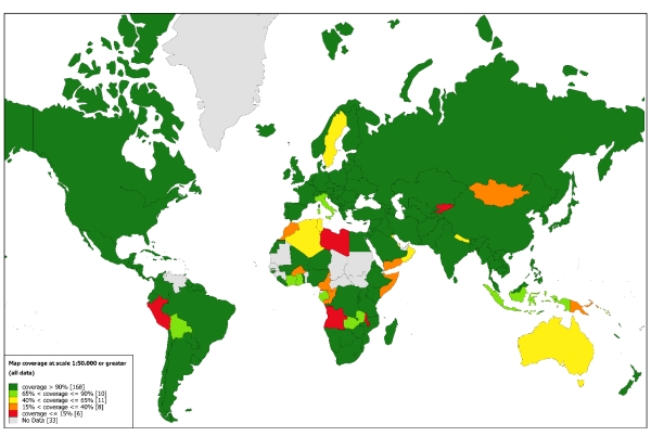 Figure 5. Current technical trends in the surveying profession (source: Lawrence,CB, 2015) (top); global availability of mapping at scale 1:50,000 (source: Konecny, 2015) (bottom) /p>