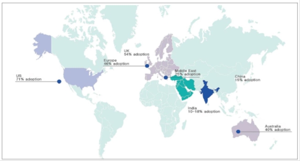 With a global construction volume of US$7.2 trillion in 2010, which is expected to raise to US$12 trillion by 2020, quantity surveyors in particular play an important role within the construction industry providing a number of services such as cost planning and budgetary estimates of projects, Value engineering / Value Management, Risk Management and calculation, Bid Documentation, Commercial Management and Contract Administration, Dispute Resolution, Asset Capitalisation, Cost Control / Management process, Assessing the costs of design changes / variations, and so on. BIM is the tool to serve and enhance such activities. The use of BIM enhances team collaboration and understanding among various professionals as well as better information management, reduction of errors, and may achieve up to 40% elimination of unbudgeted change, up to 80% reduction in time taken to generate cost estimates and may achieve a cost estimation accuracy within 3%. Other benefits of BIM include savings of up to 10% of a contract value through clash detections and a reduction in project time up to 7%. BIM has already been adopted in USA on more than 70% of projects, in Europe about 46%, in Middle East at 25%, Australia 40%, China 15% (Figure 7). There is a great desire by governments to adopt BIM in future and there is a great potential for future construction development in all regions, therefore there is an increasing need for the skills of quantity surveyors (Ong, 2015).