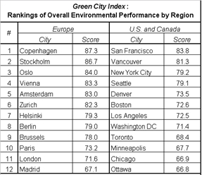 TTable 1. Up: Asian Green City Index (source: EIU, 2011) ; Right: Green City Index for Europe and US and Canada (source: EIU, 2009)