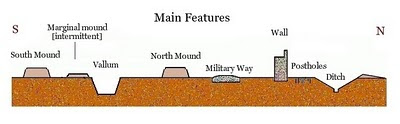 I need to clarify the interpretation of the word Vallum as literally it means a “mound of earth” but in the context of Hadrian’s Wall it more specifically describes the trench following the line of the limes or boundary line which has mounds of earth along its top edges just as the sulcus primigenius (“first furrow”) had placed along its upper edges formed from the earth excavated from the trench itself.