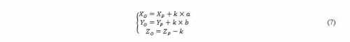 The ROI having the distance values (Zj) is now replaced by the adjusted plane, also delimitated by that ROI, in which is computed the correspondent 3D middle point P(XP,YP,ZP). The line r that contains both points P and O, and it is perpendicular to the plane face, follows the director vector v=(a,b,d) (see illustration example for the cubic block in Fig. 5). The length of PO is equal to k = h/2 = 0.016 meters.