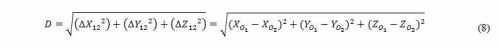 The displacement D between two consecutive locations O1 and O2 is given by the expression (8).