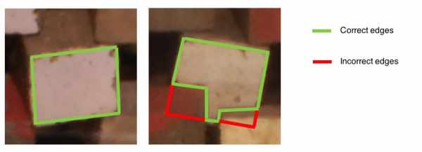 Figure 4. Hidden block situation. Left image: the block edges are correct and a proper middle point is expected. Right image: the edges are not correct and a deviation of the middle point is expected.