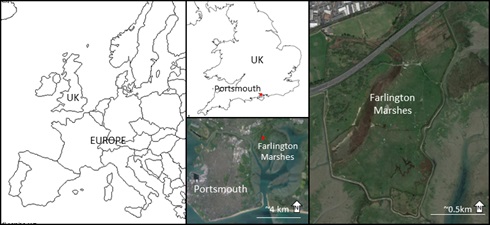 Farlington Marshes is a wetland located in Portsmouth, on the south coast of England (Figure 2). The wetland is a coastal grazing marsh that may be categorised as a “Marine intertidal marsh” according to the RAMSAR classification scheme (RAMSAR 2010, p80). The territory was originally reclaimed from the sea in the late 18th century, when a clay and timber wall was built across the mudflats, linking the natural islands that were previously occupying part of the Langstone Harbour (Hampshire & Isle of Wight Wildlife Trust (HIWWT) (n.d). Currently it is a 1,117,348 m2 wetland (~276.11 acres)  enclosed by a concrete barrier with a floodgate inlet controlling the amount of seawater allowed into the main lagoon, and features different traits such as two lagoons, reed bed patches, grazing meadows, several ponds, a network of channel and streams, comprising both fresh and brackish water bodies.