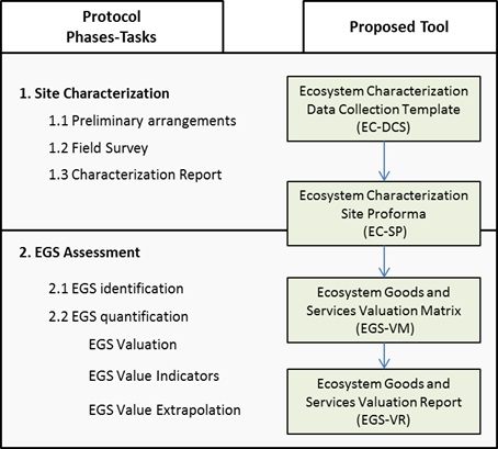 As shown in Figure 3, the methodology suggests that data collection could be done in two phases. The first phase is to assess the general characteristics of the ecosystem and to identify the various goods and services. The second phase (quantification phase) is to acquire the values of the economic parameters for the valuation of the EGS. For each phase, specific resources have been developed to provide standardised tools to make the assessment easier for the application of this methodology.