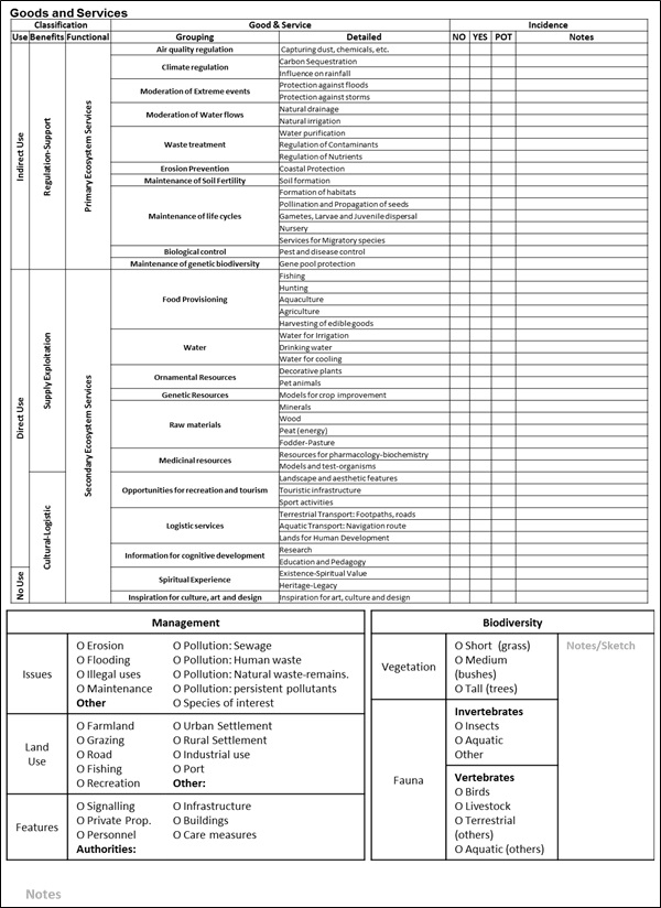 The assessment of the general characteristics of the ecosystem focuses on key features such as geomorphology, physical processes, geology, biodiversity, management issues and initial assessment of EGS. For this purpose, the “Ecosystem Characterization Data Collection Sheet” (EC-DCS) (Figure 4) was developed as a fillable template comprising some essential information, field checklists and reference maps. The comprehensive classification of EGS, management and diversity checklist is also required (Table in Figure 4.2). This list should be compiled during the pilot survey. These two field data collection tools cover the detailed information that could be gathered from the field to provide an integral description of the site, the spatial relevance (Hein et al. 2006), classification of EGS, management issues and diversity of the wetland. Note that this form is a suggestion and the fields could be modified or added as desired (e.g. water chemistry parameters), as long as the surveyor is able to gather that information. Following the field, the survey is the processing of the filed data from EC-DCS, into a written description of each site using the “Ecosystem Characterisation Site Proforma” template (EC-SP) (Table not included). This is the final product of the general characterisation. The EC-SP template comes with different sections addressing important aspects that should be of general interest while trying to understand the main ecological and socio-economical characteristics of an ecosystem. Depending on the scale of the project and design of the survey, the site Proformas may feature as a table summarising the EGS offered by the assessed ecosystem.