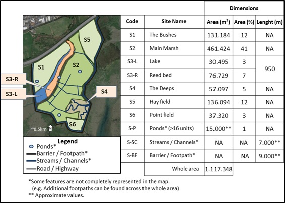 General Overview: This site is a coastal grazing marsh with lagoons, meadows, ponds and pools (may be categorized as a Marine Intertidal marsh (H) according to RAMSAR classification). It has a network of streams and channels and comprises both fresh and brackish glasses of water. The land was reclaimed from the sea in the 18th century and currently, it is enclosed by a concrete barrier with a floodgate inlet controlling the amount of seawater allowed into the main lagoon. As a whole, this marsh appears to be in good condition (4/5). It possesses various conservation designations as it provides feeding and roosting sites for several bird species. For the purpose of this assessment the area has been partitioned into 9 distinctive sections  based on different identifiable features: the bushes (S1), the main marsh (S2), the lake with its Reedbed (S3-L. and S3-R), the ramified lagoon called “The Deeps” (S4), the hay field (S5), the Point field (S6), the Ponds and Pools in the whole area (S-PP), the Channels-Streams (S-CS), and the Barrier-Footpaths (S-BF).