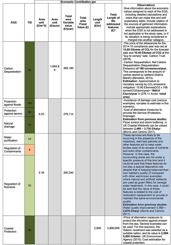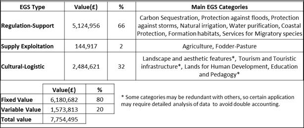 Detailed information can be extracted from the Valuation Matrix, where the individual economic contribution of each EGS category and the details about how the values were estimated are presented (because of its size, in this paper we include only an extract of the full table). The most relevant categories surpassing the £1 million limit are: coastal protection with a fixed contribution of £2,800,000 based on the replacement cost of constructing a gabion revetment at the shoreline covered by the reserve; secondly, the value of the lands for human development was estimated at  £2,208,863 based on the average purchase price of arable or pasture lands  (£8,000 /acre) provided by the RICS (2015); the last big contributing category was the services that relate to the maintenance of life cycles (habitat formation, nursery, services for migratory species, amongst others) that was valued at £1,171,819. Details of the estimations are included in a large table not suitable for this publication.