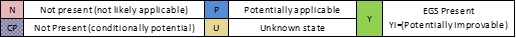 Where “TSI” is total significance index (the index is calculated for each EGS category), and the sums brackets in the numerator correspond to the number of sites in which the addressed EGS category where classified as “CP”, “P” and “Y”, where “CP” is EGS conditionally potential, “P” is EGS potentially applicable and “Y” means EGS present. Therefore, each of these values (“CP”, “P” and “Y”) could range between zero and the total number of sites. The remaining categories (Not present “N” and Unknown status “U”) are not included in the formula as they do not add significance to the EGS. Then, each summation will be multiplied by the assigned fixed constant (0.25, 0.5, and 1.0 respectively); then, the nominator will be divided by the number of sites (nsites), and then multiplied by 100. For a visual aid, colours could be assigned to the following ranks of values: red (0), orange (1-30), light green (31-70), dark green (71-100) (see an example later in Table 8).