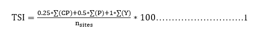 Moreover, where multiple sites are assessed, Table 2 may include a final column with a total significance index (TSI) for each EGS category (See Formula 1), as an additional aid to quantify how significant is each EGS category for the whole ecosystem. It should be noted that this is a quantitative aid for a qualitative parameter, as the real economic significance should be assessed with actual economic data in the next phases of the methodology. The proposed index is a value between 0 and 100, and it can be interpreted like this: zero implies that the EGS is not existent in the wetland, lower values suggest that the EGS is present in just a few sites or that it is not properly developed and higher values imply that the EGS is fully developed in most of the sites.