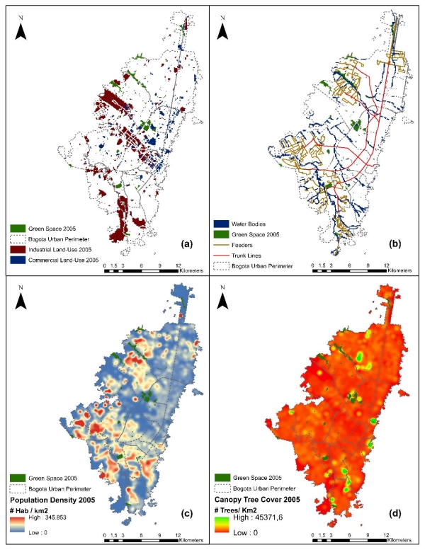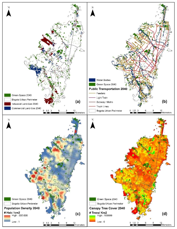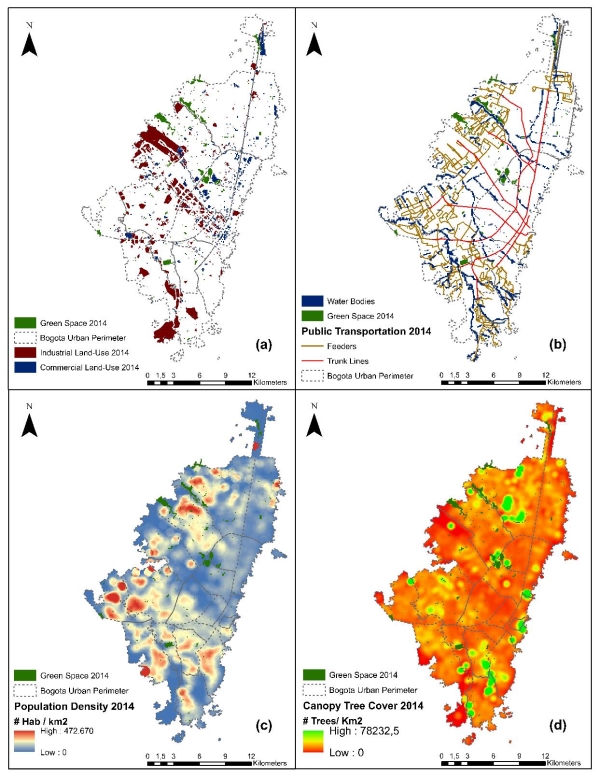 Figure 1. Spatial distribution of the population density, canopy tree density cover, public transportation network, water bodies, urban green space, commercial and industrial land uses in Bogotá in 2005, 2014 and 2040