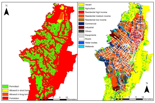 The study zone for BoLD project was divided into vacant (land uses that are available and can be occupied by other land-uses), feature (which are the land-uses that doesn’t have changes over the time) and function (which corresponds to the land-uses that are in constant change), all of them in a raster data resolution of 100m x 100m. Once the land-uses and transport accessibility where defined, the suitability zones, the zoning, the future land demands and the neighbourhood relationship between the land-uses allowed to create a different dataset for two different years: a baseline year (2005) and the calibration year (2014). Once the calibration was completed, the model was used to simulate and predict the LUCC from 2014 to 2040 in four different scenarios of transport infrastructure and natural reserve conservation (Paez & Escobar, 2016).