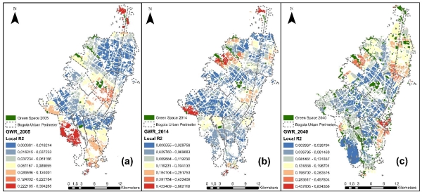 With the results obtained within the OLS regression model, it is observed that the global model meets statistical significant. In the local model, the variables will be evaluated at a cell resolution of 100m x 100m of residential land use. The results of the GWR regression model  can be seen in Table 6 for each of the evaluated years. All the models were evaluated with the four significant variables, in which it was observed that at the local level the chosen variables have a greater significance. Since the  performance in the greener scenario, the spatial pattern of these variables explains more than the 47% of the GS per capita for the year 2040, as can be seen in Figure 5 where the spatial distribution for the local R2 of the model is shown over the time.