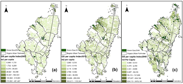 The lack of GS in the past and present in the city of Bogotá shows a problem that can still be reversed through clear and concrete actions. Among these actions, it is crucial that the future city plan has a more sustainable approach. That why the LUCC models are used, as it allows to establish greener scenarios with the current city policy. Likewise, the application of Local (GWR) and Global (OLS) regression models allows proposing a methodology to quantify and measure the future GS per capita, through present variables that are quantifiable and can be measured over time. This methodology it is proposed as a way to measure GS in CA models.