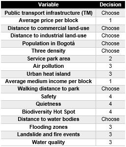 Within the research, it was taken into account not only the international literature but also the national and case studies in Bogotá; however, GS in Latin America and in, the Colombian case, are very low; as this is not yet a priority for governments. It is also important to highlight that there are variables that could be much more representative, however such as housing price, crime rate, sustainable projects, land value, urban biodiversity and more; but the lack of updated and detailed information as well as the level of resolution represent an important challenge when estimating future scenarios.
