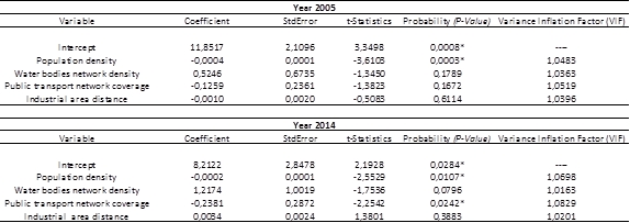 In addition, it was observed that only four of the six variables in Table 1 were significant in the spatial regression model. Afterwards, an OLS regression model was run with the most representative variables in a global model. Results can be observed in Table 2 and Table 3. In these, the only variable that is representative and can describe the GS per capita in 2005 is population density; meanwhile, in 2014, it was added the coverage of the public transport network as another representative variable. This representability is mainly given by the p-value statistics, even if the rest of the criteria was fulfilled. Likewise, it is important to note that once the p-value is fulfilled, the t-statistics will also be met.