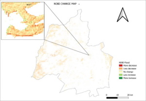 There was a need to exclude the non-built up areas from the differencing process, hence any feature which corresponded to non-built up was assigned no data value.  The image that results is utilized to determine the NDBI Difference. Figure 8 below shows the results of the change detection calculations for the Cyclone Idai flood occurrences.