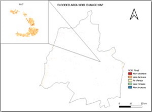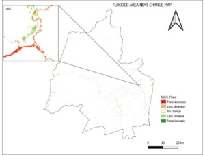 The change detection statistics are calculated based on the extracted flooded NDVI change area with reference to the changes represented in the figure above. The more decrease and less decrease are classified as negative change, the less increase and more increase as positive change while no change remains the same. The results are shown in Table 2.