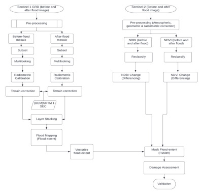 In terms of Zimbabwe’s context, some authors only determined the Cyclone Idai’s flood extent while others estimated the general damage and losses that came as a result of the cyclone which did not clearly bring out the exact damage and loss that came as a result of flooding. As a result, the main research gap in the current study is the inadequacy of knowledge regarding the amount of damage and loss that resulted from the cyclone’s flood in Zimbabwe’s Chimanimani district. Therefore, the objectives of this research are to (i) spatially explicitly map the flooded area extent, (ii)evaluation of the effects of flood brought on by cyclone Idai through moderate spatial resolution imagery (Radar and Optical) and (iii) determining the amount of damage and loss brought on by cyclone Idai’s flooding events as per land-use class. The novelty of this study was on using radar in mapping flood extents and then fusing through feature level fusion, with optical data considering spectral indices, thus, NDVI and NDBI. Change detection based on the NDVI and NDBI spectral index on the inundated area is conducted with the intention to determine damage and loss within the study area.