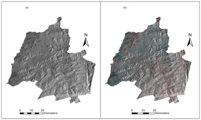 Figure 5. Showing Chimanimani (a) Pre-flood period, with dark gray color representing the river channel and (b) Post-flood period, with the red color representing the flooded river channel.
