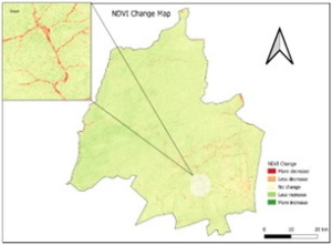 NDVI was employed in this work to track changes in plant cover using the downloaded Sentinel-2 data. An indicator of vegetation greenness used in remote sensing, the Normalized Difference Vegetation Index (NDVI), is linked to the structural characteristics of plants. NDVI time series can be used to analyze the majority of vegetation changes (Forkel et al, 2013). The visible and near infrared portions of the electromagnetic spectrum are used by the NDVI. This is due to the fact that vegetation, such as forests, exhibits substantial absorption in the red area (0.63-0.69u m) and increased reflectance in the near IR range (0.76-0.90u m). The distribution of vegetation is specifically defined by this ratio. The following formula is used to determine NDVI values:   NDVI= (NIR-RED/NIR+RED) The NDVI readings are displayed as a ratio from -1 to +1, with the majority of the (-) values denoting water and the rest values falling within the negatives denoting soil/built-up. The categorization considered the variation in NDVI values before and after floods and decided that positive values indicated the presence of vegetation, while negative values indicated that there was no vegetation present and were represented as No Data values.