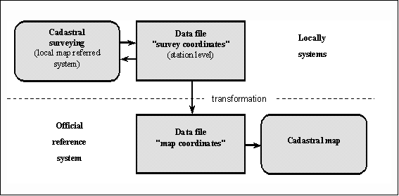 In addition to "survey coordinates" with an exactness of 0,02 m "map coordinates" for the cadastral map are kept as well. They are calculated from survey coordinates through transformation about identical control points and comply with the regulations of exactness 0,2 m because of cadastral map scales (1:1.000). That is the reason why changes of the relation system are not able to detract from map precision and can be controlled in spite of quantity. In Saxony-Anhalt there are kept 2 data files for cadastral measure and computations as emerges from the following figure 1.