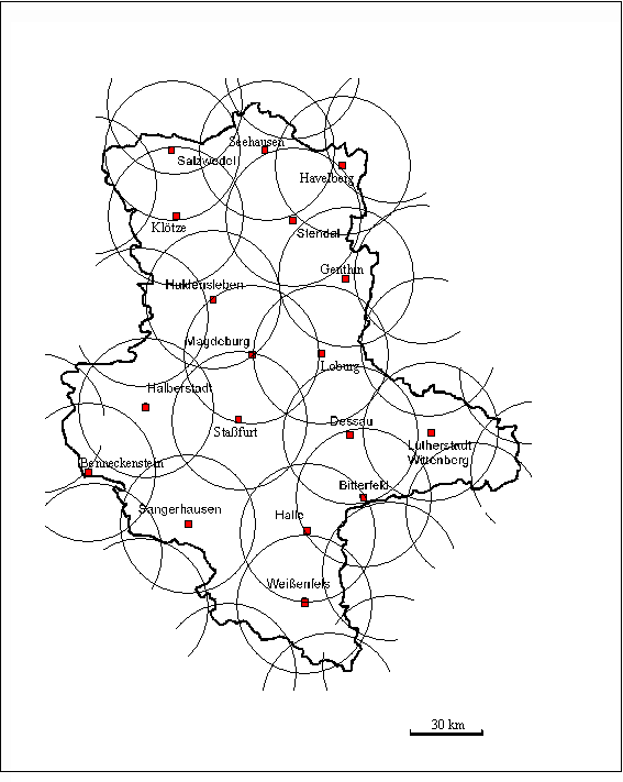 Presently 40.000 control points of horizontal control network are getting determined anew by satellite-assisted procedures. The state Saxony-Anhalt has been covered area-wide by 18 permanent satellite reference units (distance 30 to 50 km). With the help of this units cadastral surveying and more detailed surveying, positioning and navigation can be carried out precisely and very economically. The permanent satellite reference units function as representatives of the official location reference system ([Beul 1995], [Patzschke, Leipholz 1996], [Kummer 1998a]). The area-wide construction of permanent units is shown in the following figure 2.