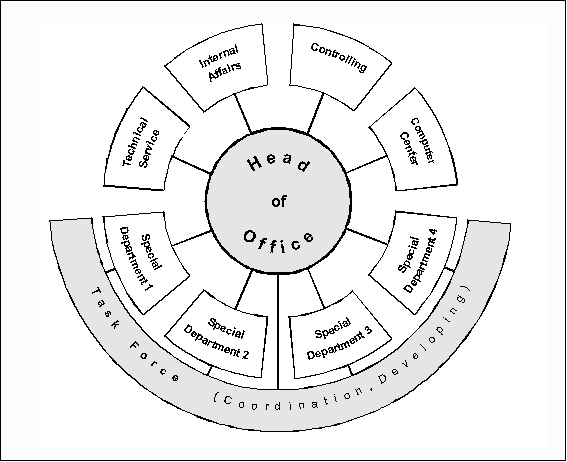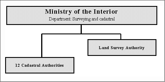 The multi-step hierarchy structure of authorities was cut back for the benefit of only 1 organization level-departments. The departments are the only organizational units. For example the Land Survey authority is with 400 employees structured as follows [Kummer 1999a]: