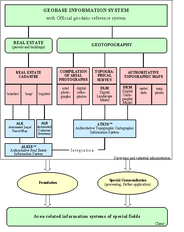 Today the official surveying in the Eastern states of Germany has reached West German standards and it offers a high level of quality assurance. Main focus of professional development referring to official surveying of every federal state in Germany is to merge all registers of real estate cadastre with official geotopography in order to have an integrated, area-related, automated geobase information system of the country [Beul 1998], [Grote 1999]. The conception as a whole is shown in the following figure 5.