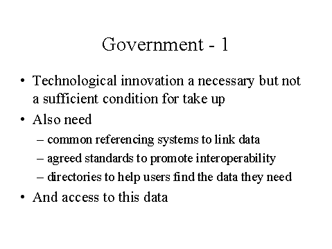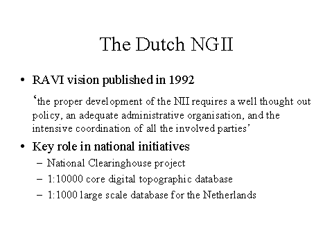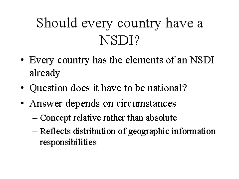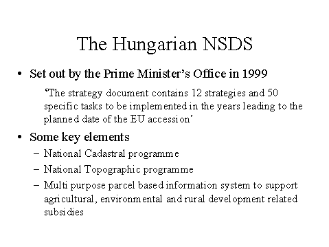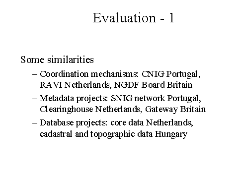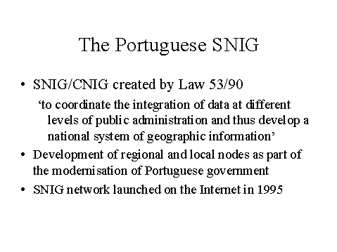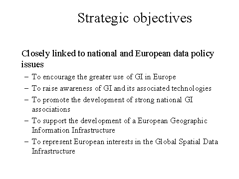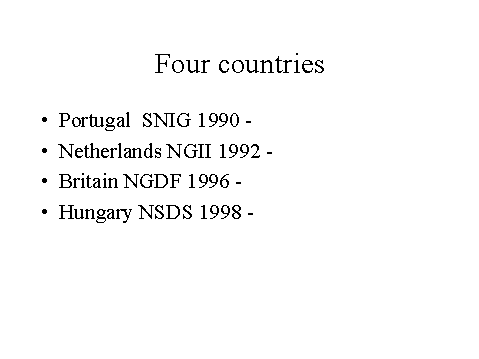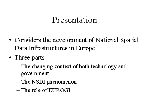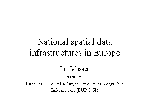 The presentation will consider some recent developments in spatial data infrastructures in Europe. It will be divided into three parts. The first of these examines the changing technological and governmental context that has prompted the recent surge of national spatial data infrastructure initiatives in Europe and elsewhere in the world. Then the experiences of NSDI initiatives in Portugal, Netherlands, Britain and Hungary will be described and evaluated in comparative terms. The final part of the presentation will describe the work that is being currently undertaken by the European Umbrella Organisation for Geographic Information (EUROGI) to facilitate the development and implementation of spatial data infrastructures at the national, regional and global levels.