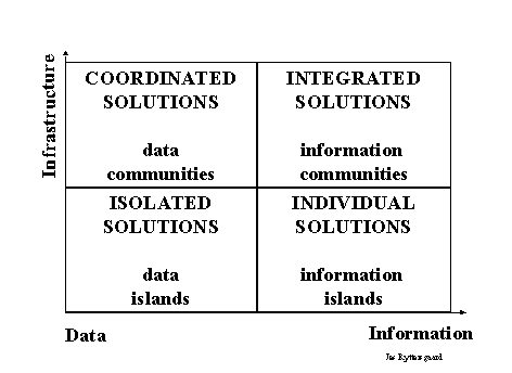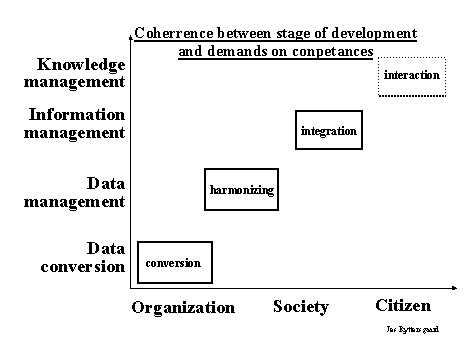 The different organizations do not have to go through all the phases. Many starts with letting one or more technicians purchase equipment for digitalisation and conversion of data. In those cases there is great risk that the technicians afterwards will sub-optimize in order to protect their own position of power. The organizations would develop faster if they changed the focus from production to utilization. The best would be to start with developing a strategy for the future use of data and information. Presumably it would be more profitable to outsource establishment and conversion. 3. REALIZED DEVELOPMENTSWith another simple model I will illustrate some realized and some foreseeable courses of events and/or developments. Developments that support my assertion on need for changes in and introduction of new competence. The model is so general and robust that it can be used as well on one organization with several departments as on a number of institutions independent of the stage of development.