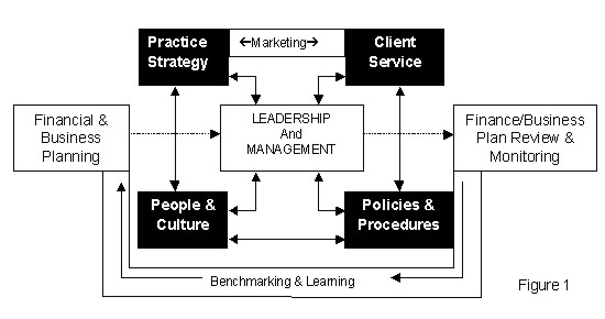 3. AN ALTERNATIVE APPROACHOne of the current themes in the management literature is the idea of 'best practice'. Identify it, copy it/adapt it and implement it and, so the prevailing view seems to suggest, nirvana will follow. But is the concept of 'best practice' sensible? Of course, 'very bad I don't believe what I have just seen practice' exists so perhaps 'better or good practice' might also exist - but 'best' ? This dilemma was one which we faced after winning, in conjunction with the Royal Institution of Chartered Surveyors (RICS), a UK Department for Trade and Industry (DTI) 'Skills Challenge' award. The DTI funded a project to identify 'best practice' in the management of small to medium sized professional practices. The work was initially undertaken with 12 Managing Partners of firms of chartered surveyors, although subsequently the outcomes have proved to be transferable across the professional service sector (and more recently into public sector organisations employing professionals). Our challenge was to project manage a process which would synthesise 'best practice' and capture this for further dissemination. Our initial approach involved a review of current definitions of 'best practice' in the field. In the process we uncovered several very useful frameworks. These ranged from the UK 'Investors in People' standards, the National Vocational Qualification standards for owner managed businesses and customer service, the European Foundation for Quality Management (EFQM) model of quality, the US Baldridge award framework for business excellence and the International Standards Organisation (ISO) 9000 series of quality management systems. In addition we also uncovered several frameworks designed more specifically for the professions, including the Institute for Chartered Accountants In England and Wales (ICAEW) Practice Management Aims, the Surveying Society's Practice Management Standards. All contributed to our thinking - particularly those which approached the issue from a self-assessment 'diagnostic' viewpoint, rather than from a more prescriptive 'do this' standpoint. Out of this initial work with our collaborating partners we devised our own framework. Our aim was not to replicate what had already been produced. Intuitively we all recognised at the time that 'prescription', for all the reasons already mentioned, had its limitation. Our alternative approach focused around the identification of the key management challenges faced by the Managing Partners with whom we were working. From this we wished to uncover the critical questions which would help new partners/managing partners to better understand the nature of management in a professional practice. 4. THE RICS PRACTICE MANAGEMENT GUIDELINES FRAMEWORKThe framework we eventually used to synthesise the various strands of thinking identified by our partners is illustrated in Figure 1. The model illustrates the inter-linking between the various aspects of the process of managing either an entire practice or a business unit within a larger firm.